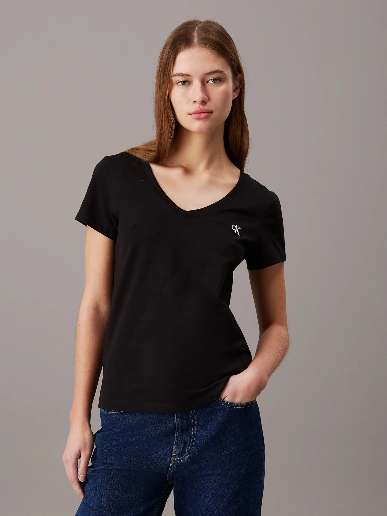 Calvin Klein dames T-shirt met CK-borduurwerk, V-hals van stretchstof, zwart, maat S